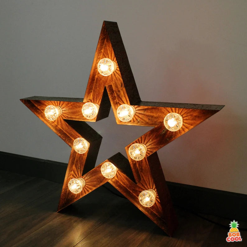 The Americano Marquee Star Light is a 75cm illuminated metal star made from raw steel with a natural rusted finish. The surface is sealed with a clear gloss powder coat to preserve the appearance and prevent rust transfer.